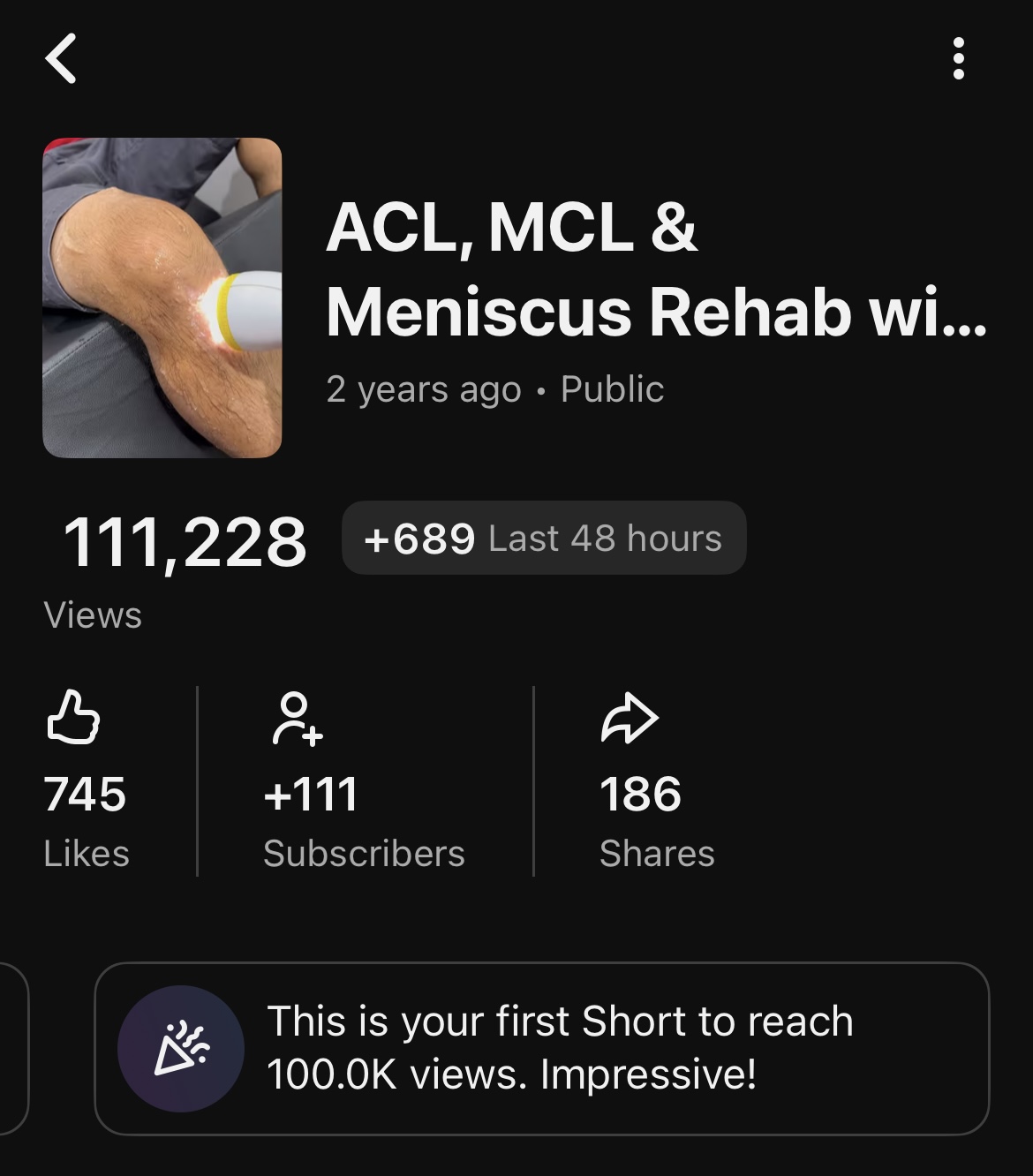 A recent YouTube Short titled “ACL, MCL & Meniscus Rehab with SoftWave Therapy” reached a major milestone — over 100,000 views, becoming the most-watched video ever on our channel. In just the last 48 hours alone, the video gained hundreds of new views, over 700 likes, 180+ shares, and helped our clinic gain more than 100 new subscribers.